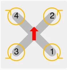Si el motor gira en sentido contrario, debes invertir el giro . Para ello puedes intercambiar el cable en el variador, o hacer el cambio mediante software desde el configurador de BLHeli. Aquí tienes la imagen de como debe ser el sentido de giro de las hélices.