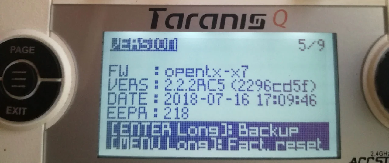 Para saber que versión tenemos enciende la emisora, mantén pulsado el botón Menú (el botón central en una QX7) unos segundos para acceder a la configuración general de la emisora, y a continuación pulsa Page hasta el apartado Version, ahí visualizarás que versión tienes instalada.