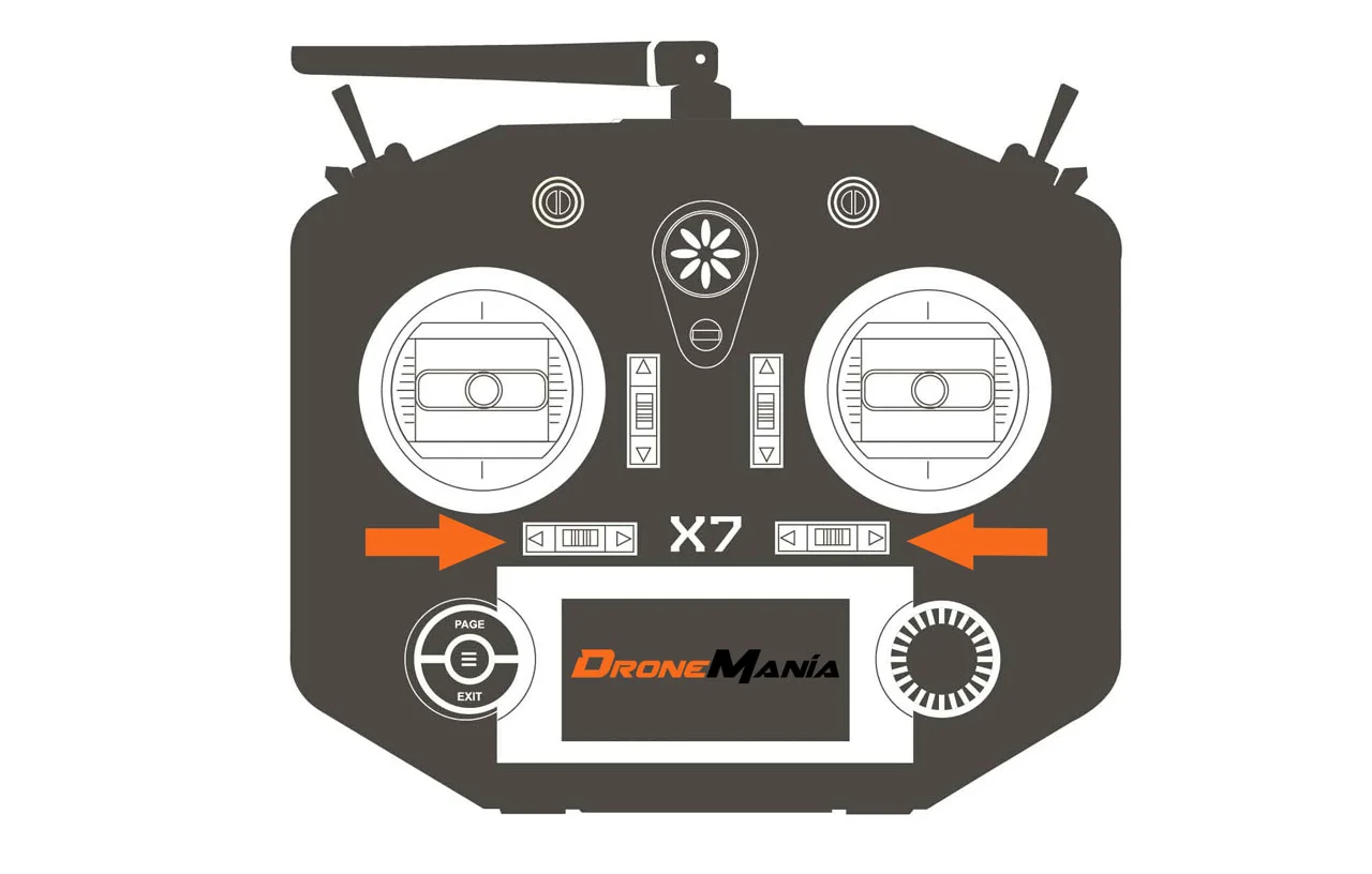 En una Taranis QX7 y X9D , con la emisora apagada pulsa los *trimms *de centrado hacia adentro y pulsa el botón de encendido. La emisora se encenderá en modo Bootloader . Ahora ya puedes conectar el cable USB .