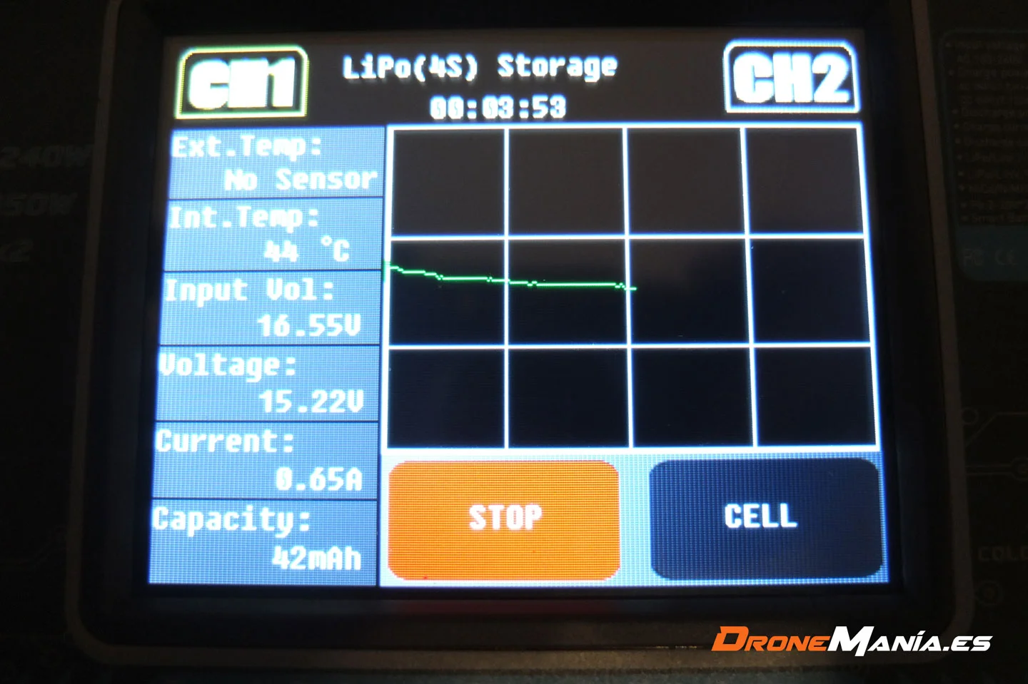 En esta pantalla, la de almacenamiento, podemos observar la temperatura interna del HTRC T240 Duo , el voltaje total de la batería, el amperaje que estamos aplicando sobre la batería, así como los mAh que hemos cargado a nuestra batería LiPo. Además observamos el gráfico que se va actualizando en tiempo real sobre el estado de carga de la batería.