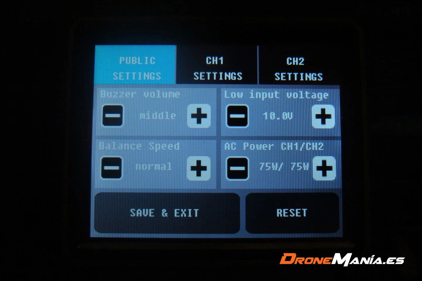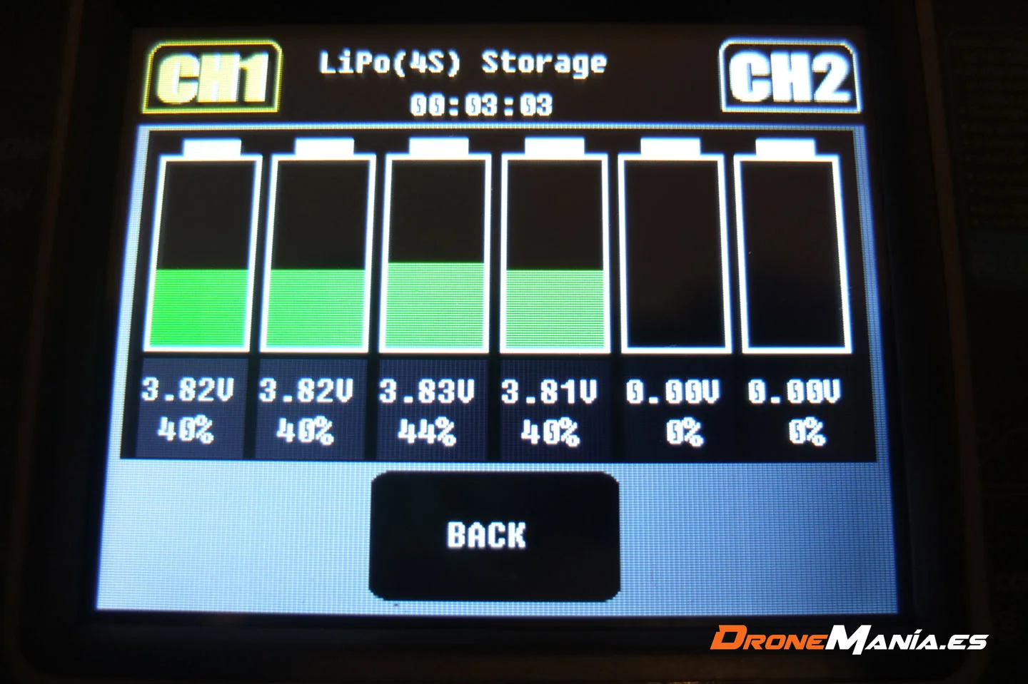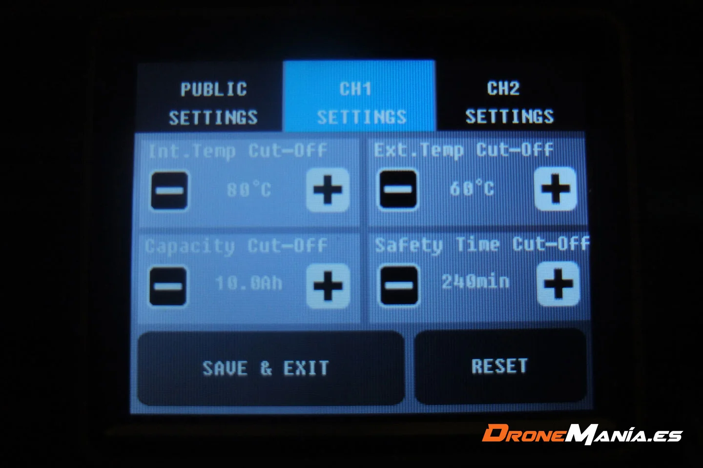 Como vemos en la imagen superior, el menú dispone de dos canales , CH1 y CH2, uno para cada batería que conectemos.
