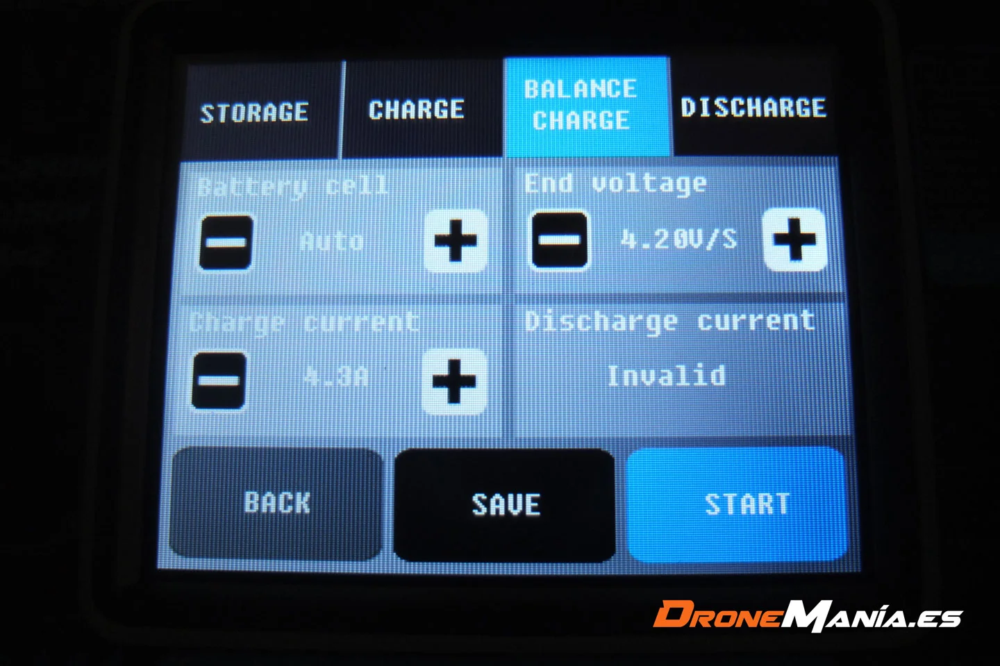 Como viene siendo habitual, las más utilizadas son Storage y Balance Charge . En esta pantalla del HTRC T240 Duo también definiremos los diferentes valores que se aplicará a nuestra batería LiPo.