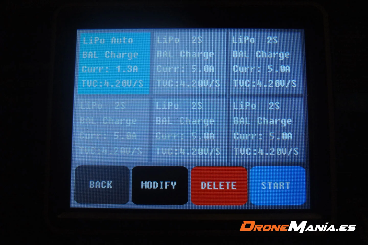 Como puedes observar, podemos almacenar hasta seis perfiles de configuración diferentes que podremos más tarde seleccionar al comienzo de la carga, con lo que nos ahorrará tiempo al no tener que ir configurando cada tipo de batería.