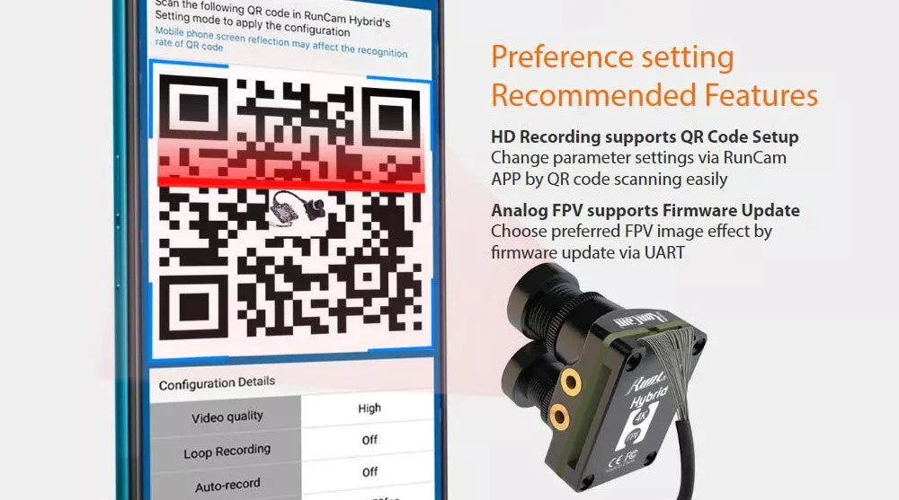 En esta ocasión Runcam ha utilizado el método para configurar los valores de esta Runcam Hybrid mediante códigos QR , al igual que ya hace con la Runcam 5, de esta manera podemos configurarla de una manera muy sencilla a través del móvil. El método es muy sencillo, a través de la aplicación para móviles se configuran todos los parámetros, esto nos dará un código QR, y tan solo deberemos colocarlo delante de la cámara para que se aplique dicha configuración.
